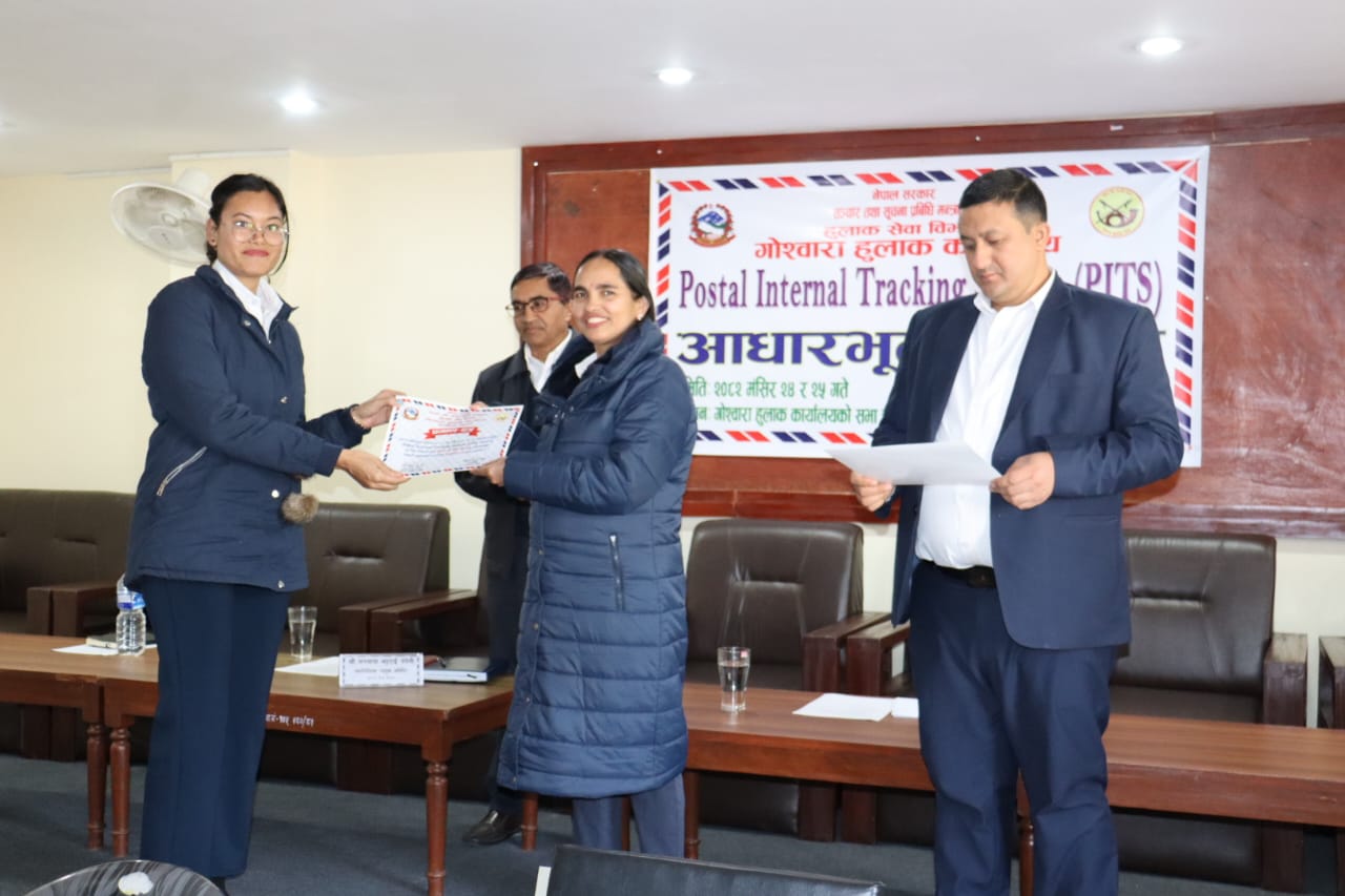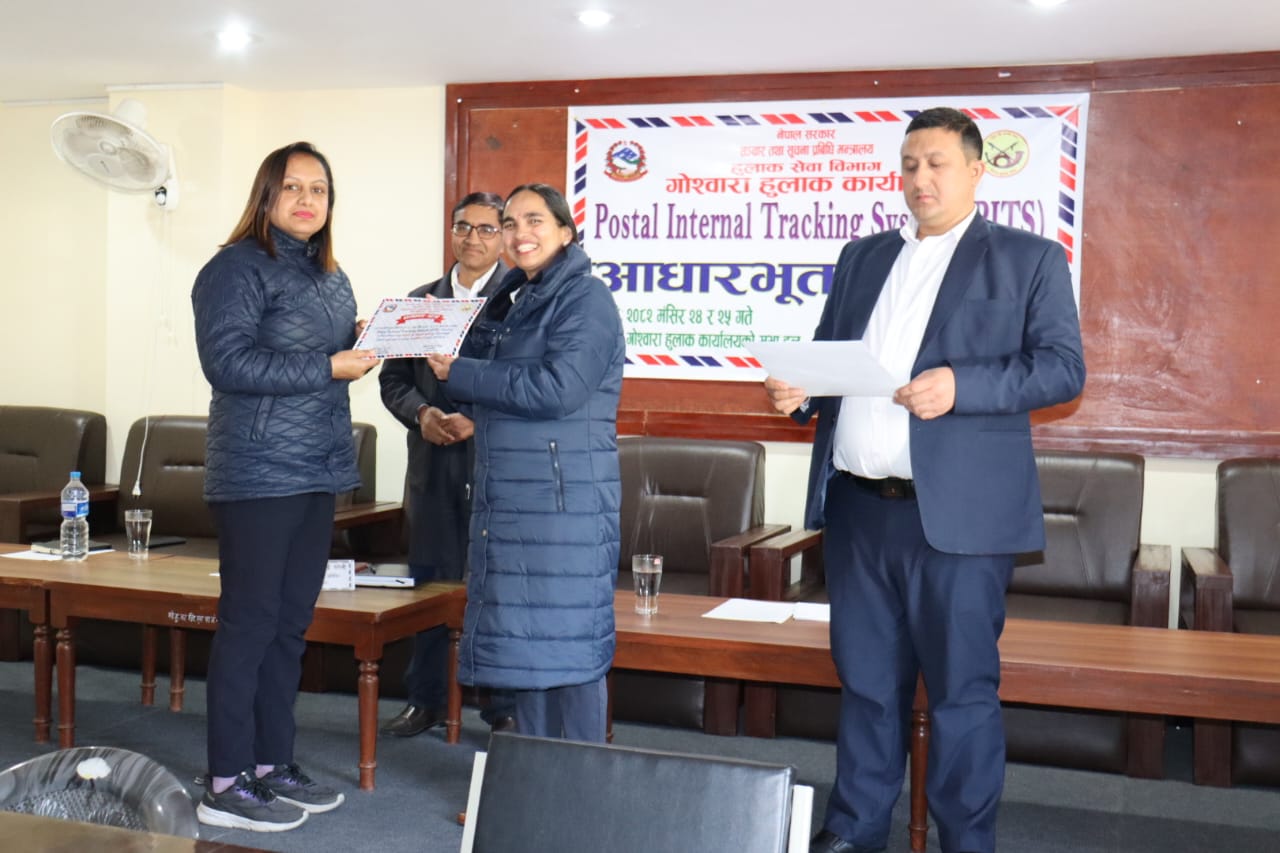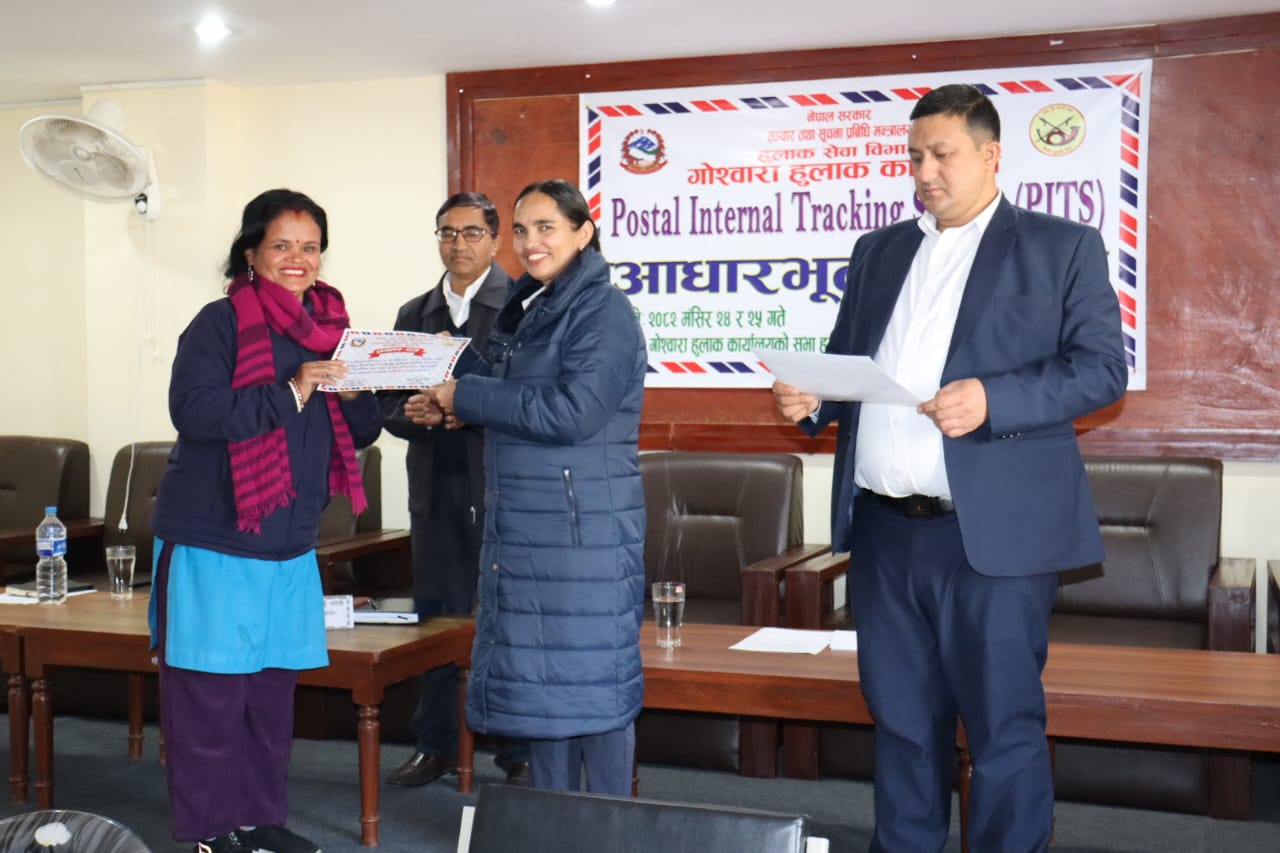 Postal Internal Tracking System (PITS) सम्बन्धि २ दिने आधारभूत तालिमको समापन समारोहमा हुलाक सेवा विभागको महानिर्देशक ज्यूको उपस्थितिमा लिईएका प्रमाणपत्र वितरण र समापन सत्रका केही झलकहरु